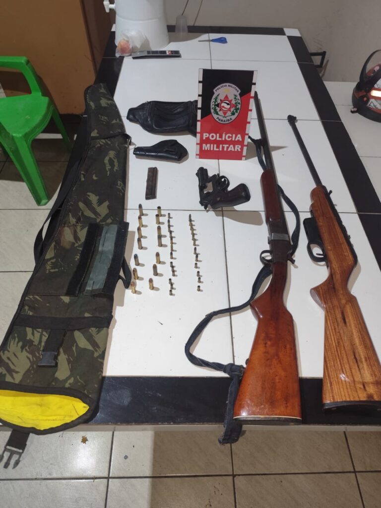 A guarnição policial militar em atendimento de ocorrência de violência contra a mulher, apreendeu armas e munições em Bonito de...